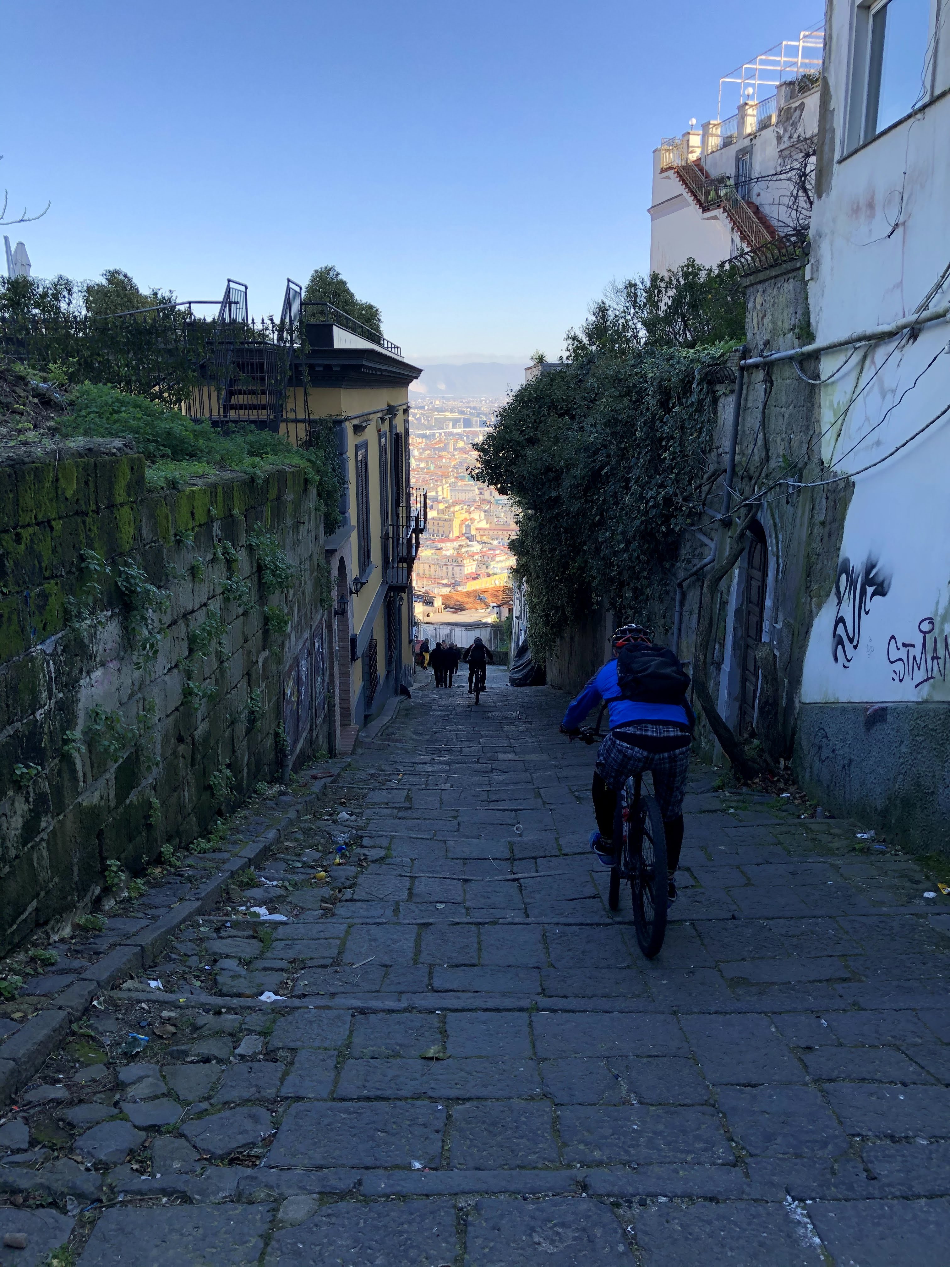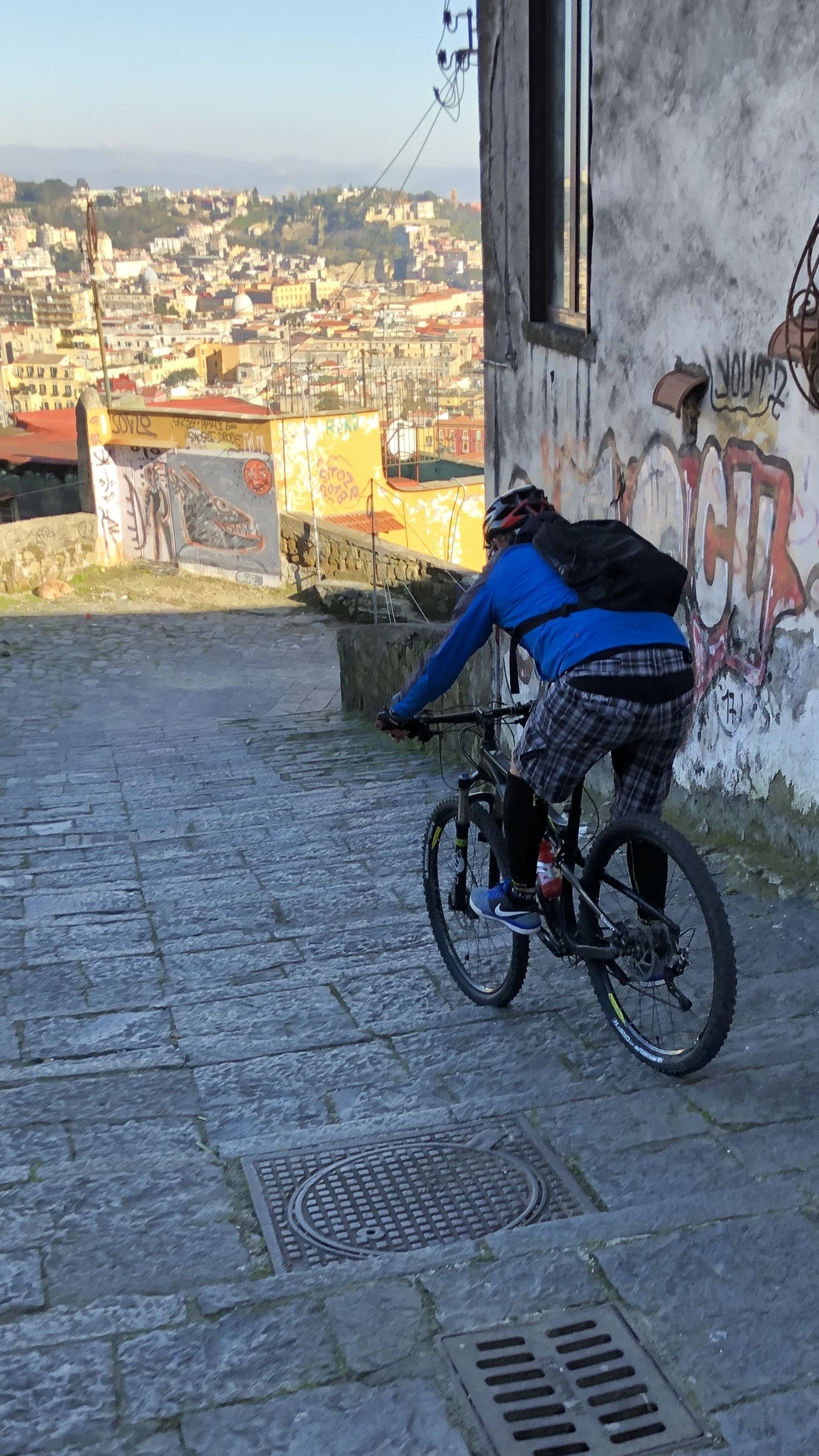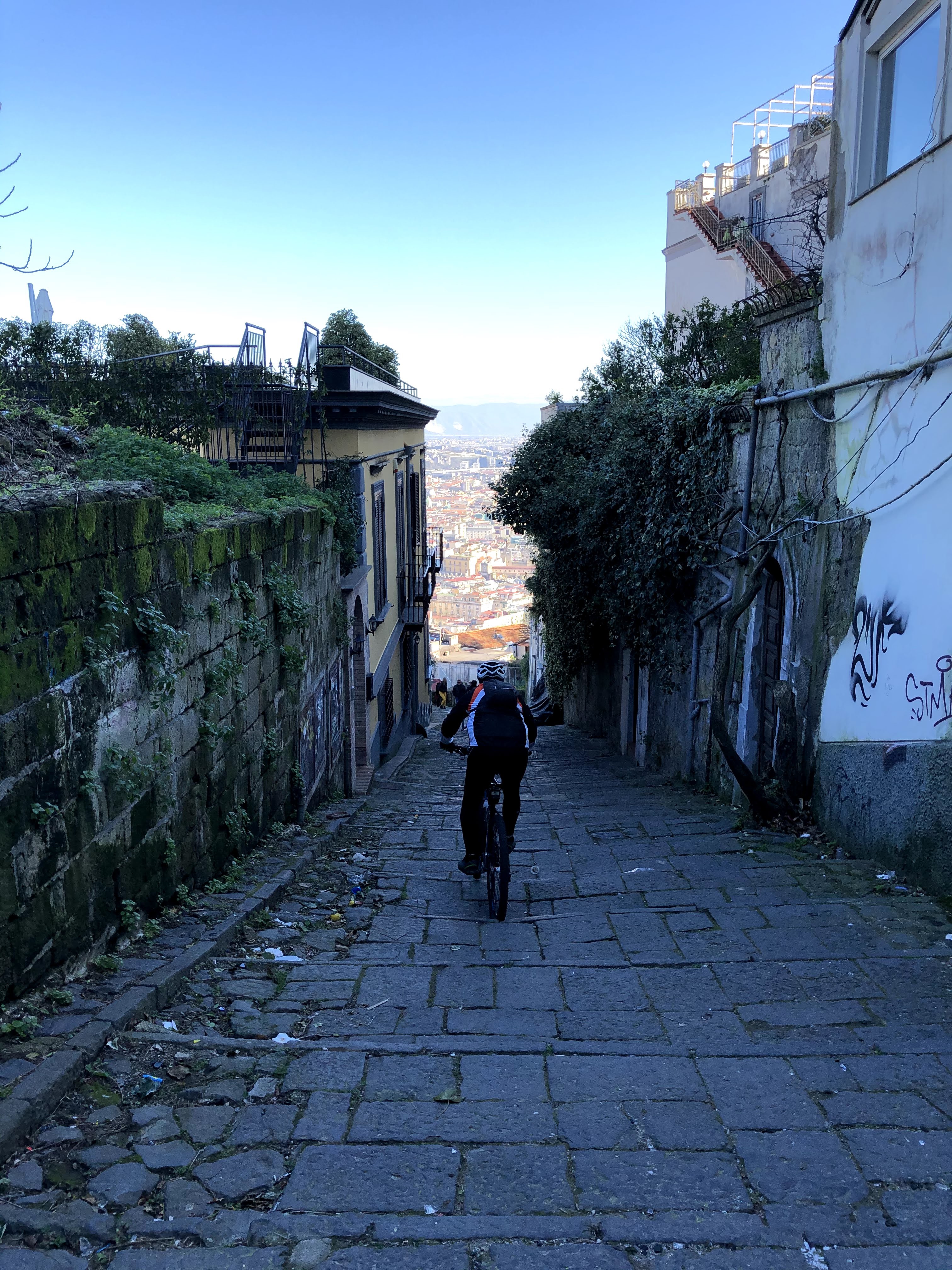 Contrariamente a quanto letto sui social (mai fidarsi), il parco è ancora in gran parte chiuso per manutenzione. Riusciamo comunque a fare un po' di sterrato ed a lanciarci in salto su una ripida rampa di scale. Usciti dal parco, seguiamo Raimondo che attraverso strade secondarie ci porta in zona ospedaliera, poi giù al Vomero ed infine su fino San Martino.