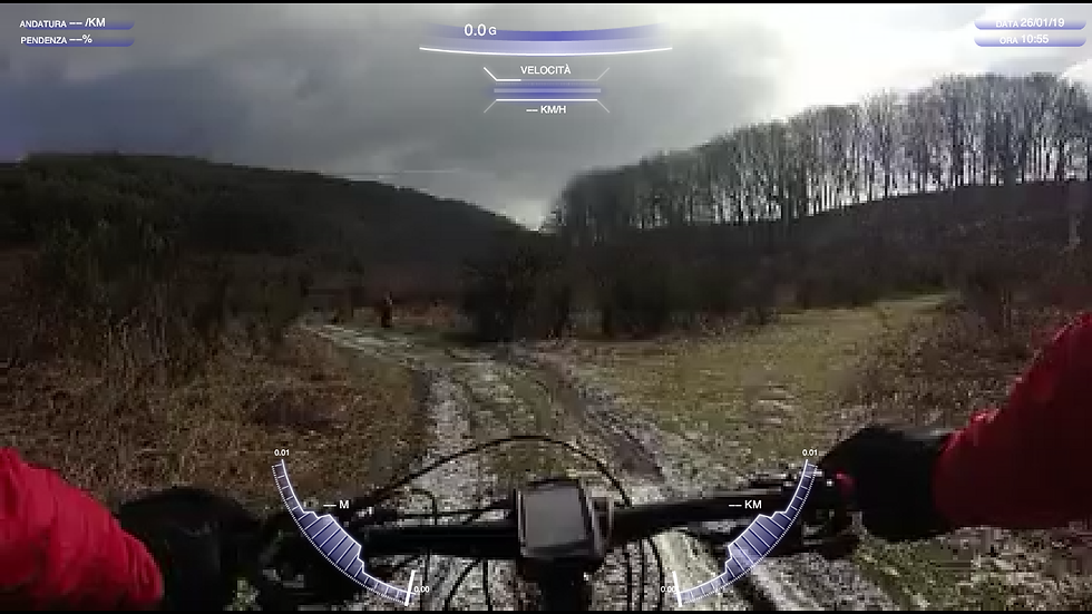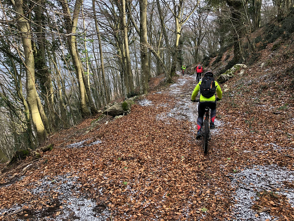 Arriviamo abbastanza freschi al crocevia, da noi già percorso più volte, alle spalle del Castle Trail. Qui un momento di commozione: Raimondo si rende conto che il percorso che seguiremo ripercorre gran parte della sua prima avventura in MTB, nel oramai lontano Marzo 2016 (link). Ancora fervido è il ricordo della fatica che lo aveva sconquassato e del passaggio elemosinato ad un ruspante contadino in Panda. Ora però i tempi sono cambiati, Raimondo è in piena forma ed è sicuro di salire fino in cima senza aiutini di sorta.