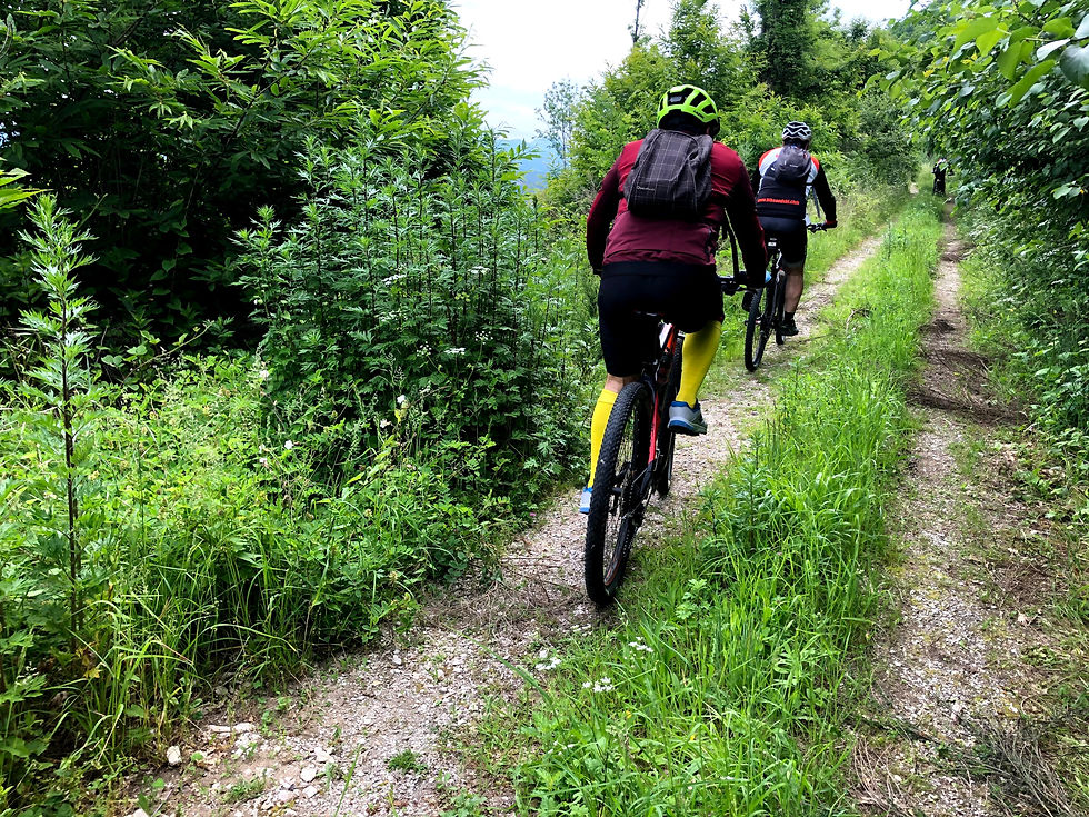 Mario su e-bike e Andrea su front vanno belli spediti. Alfonso procede in maniera tranquilla. Raimondo arranca in coda, maledicendo queste lunghe settimane di inattività forzata. Dopo circa un'ora arriviamo nuovamente su sterrato, ma si continua a salire. Dopo circa 1 km e mezzo siamo su un falso piano e raggiungiamo il piccolo santuario, nascosto nel bosco di nocelle e castagne.
