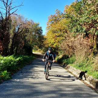 Continuiamo a pedalare su asfalto in leggera salita. Oltrepassiamo l'abitato di Mercato San Severino fino ad arrivare al primo tratto impegnativo. Una salita lunga 1800 metri per un dislivello di 160, quindi parliamo di una pendenza media del 8%.