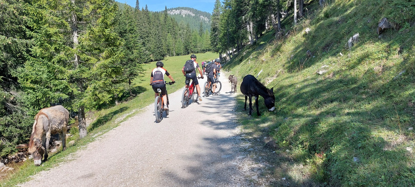 Ripartiamo ma incontriamo non poche difficoltà nel trovare la ciclabile verso Sennes. Siamo costretti a percorrere un paio di km su strada statale. Poi, finalmente, ci immettiamo su strada bianca. Iniziamo la salita verso il rifugio (7,5 Km e 650 m di dislivello positivo). Qui Monica cade con stile (10 punti), avendo assecondato la oramai non più amata sorella, sulla marcia da utilizzare in salita (5 punti pure a Lucia per consiglio errato). Entriamo nella valle di Sennes e ci fermiamo per un caffè al rifugio Ra Stua. Poi proseguiamo in uno scenario bucolico mozzafiato, incrociando mucche ed asinelli.