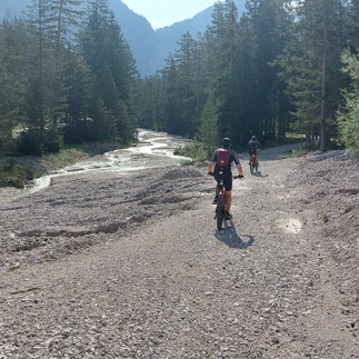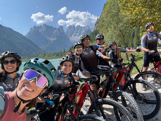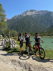 Dopo pochi chilometri raggiungiamo poi il lago di Dobbiaco. I novelli biker Monica, Lucia, Chiara e Livio tengono bene il passo dei più navigati Luca, Emilio, Roberto ed Alfonso. Dopo qualche esitazione sulle migliori combinazioni da usare tra livello di assistenza (eco, tour, mtb, turbo) e rapporto (10 velocità nel pignone posteriore), le KTM sembrano ora non avere più misteri per i giovani rampanti bikers.