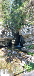 Lasciamo alla spicciolata il Pederù, con Monica, Livio, Alfonso e Roberto alla coda dal gruppo. La salita forestale è molto impegnativa, tra costoni di roccia franati, su un fondo di brecciolino irregolare. Qui, dopo il primo tornate una nuova caduta di Monica (10 punti). Nessun danno, anzi la caduta ci permette di scoprire, nascosta dietro la curva, una bella cascata.