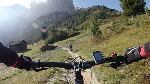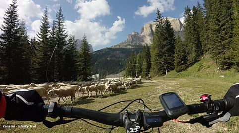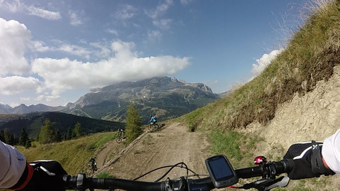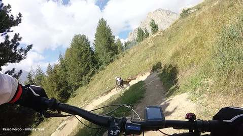 Alfonso e Raimondo, tornano indietro e incontrano nuovamente le 3 escursioniste. Al loro passaggio le ragazze ridono ed una di loro dice "Ragazze ho vinto la scommessa, l'avevo detto che quei tipi sarebbero tornati indietro!". Ridendo con loro per non piangere, le salutiamo e raggiungiamo l'impianto Fodom percorrendo a tutta, due divertenti single track. Preso l'impianto, arriviamo al passo Pordoi dove imbocchiamo l'ennesimo single track Infinity, lunghissimo e difficile trail che ci conduce fino a Canazei.