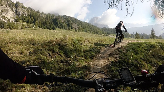 Ci mettiamo in sella e ci dirigiamo verso il rifugio Pralongià, pedalando su veloci discese e lunghi tratti in forte salita. Arriviamo quindi ad un nuovo single track, il Flé, molto molto divertente, che percorriamo indenni tutto di un fiato.