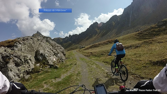 Roberto trascina con tutte le sue forze la pesante e-bike lungo la salita, seguito da Emilio ed un pimpante Gerardo. Alfonso e Raimondo urlano di tornare indietro: per loro è impossibile proseguire ed inoltre non sappiamo cosa troveremo dopo il passo Padon, che da questo momento in poi tutti chiameremo il "Passo ra Maronn". Tre giovani escursioniste, che percorrevano in discesa a piedi il sentiero, assistono divertite a questo confronto tra i due schieramenti. Alla fine si decide di separarci: Roberto, Emilio e Gerardo continuano a salire. Alfonso e Raimondo tornano indietro verso il passo Pordoi. L'idea è di ritrovarci in Val di Fassa a Canazei.