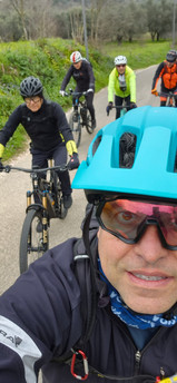 Ultimato il montaggio del pacco pignoni, una voce amica richiama la nostra attenzione dalla strada. E' Nicola, il mitico Nic Gambalesta, che appare nei nostri giri e nei nostri racconti con grande parsimonia. La sua MTB è in manutenzione (si dice da 3 anni) e oggi ci raggiunge per un saluto con una splendida bici gravel in carbonio, ultimo suo acquisto. Per l'impegno e la perseveranza oggi riceverà anche lui i punti B&S, anche se sarà con noi sul tratto stradale iniziale.