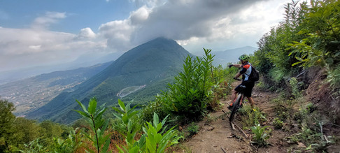 Il sentiero però è un vicolo cieco. Torniamo quindi giù e senza troppe pause-raccolta arriviamo nuovamente alla provinciale tra Monteforte e Forino. L'opzione di scendere a Monteforte via asfalto e poi risalire al boschetto su sterrato, aggirando quindi il fatidico cancello ma aggiungendo una decina di chilometri ai 26 iniziali e altri 400 metri di dislivello, viene bocciata sul nascere, Decidiamo però di continuare l'esplorazione e ci buttiamo in un secondo sentiero a noi sconosciuto, in direzione Est. E' l'occasione per raccogliere ancora qualche castagna. Pedaliamo per circa 500 metri ed incontriamo due escursionisti che ci spiegano che il sentiero ci avrebbe condotto su una nuova cima (quella vista dalla cresta del monte Esca) per poi ridiscendere su Forino.