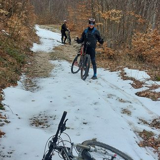 Proviamo a lanciarci ma le bici scivolano come delle saponette. Raimondo, che è in sella ad una front, cade rovinosamente per due volte. Procediamo quindi con molta cautela. Poi il sentiero si allarga e prendiamo velocità.
