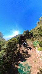 Arriviamo finalmente alla discesa e ... il pessimismo di Raimondo era giustificato. Il tratto finale sarà un continuo scendere dalle bici, caricare le medesime in spalla e superare alberi caduti. Poi quando il bosco si dirada il sentiero converge nel letto di un ruscello in secca. Di restare in sella non se ne parla proprio e continuiamo a trascinare le bici sulle grosse pietre.