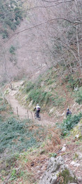 Decidiamo di prenderci altri 10 minuti di pausa e mangiamo barrette e bustine di zucchero per tornare ad avere un minimo di energie per il prosieguo. Ci lanciamo sulla discesa ... ma il divertimento dura pochi secondi: il sentiero è pieno di tratti impraticabili e siamo costretti a proseguire a spinta per almeno un chilometro. Omettiamo nuovamente i coloriti commenti di tutti all'indirizzo di Alfonso, reo stavolta di aver scelto un sentiero non pedalabile, dopo una salita da gran premio della montagna.