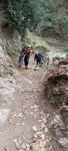 Qui però commettiamo l'errore più grande. Decidiamo infatti di proseguire lungo questo sentiero, mentre la nostra traccia ci indicava di piegare verso destra. Ora il sentiero è pedalabile e percorriamo in velocita alcuna centinaia di metri. Qui incontriamo nuovamente Catello il boscaiolo con i suoi 2 cavalli da soma: "E che ci facite ca' ?" esordisce Catello. "o' sentiero per la casa rossa e cchiu sopra". Catello infatti ci dice che non dovevamo prendere il sentiero in discesa, ma proseguire e, dopo poche decine di metri, avremmo trovato il sentiero pianeggiante fino alla casa rossa.