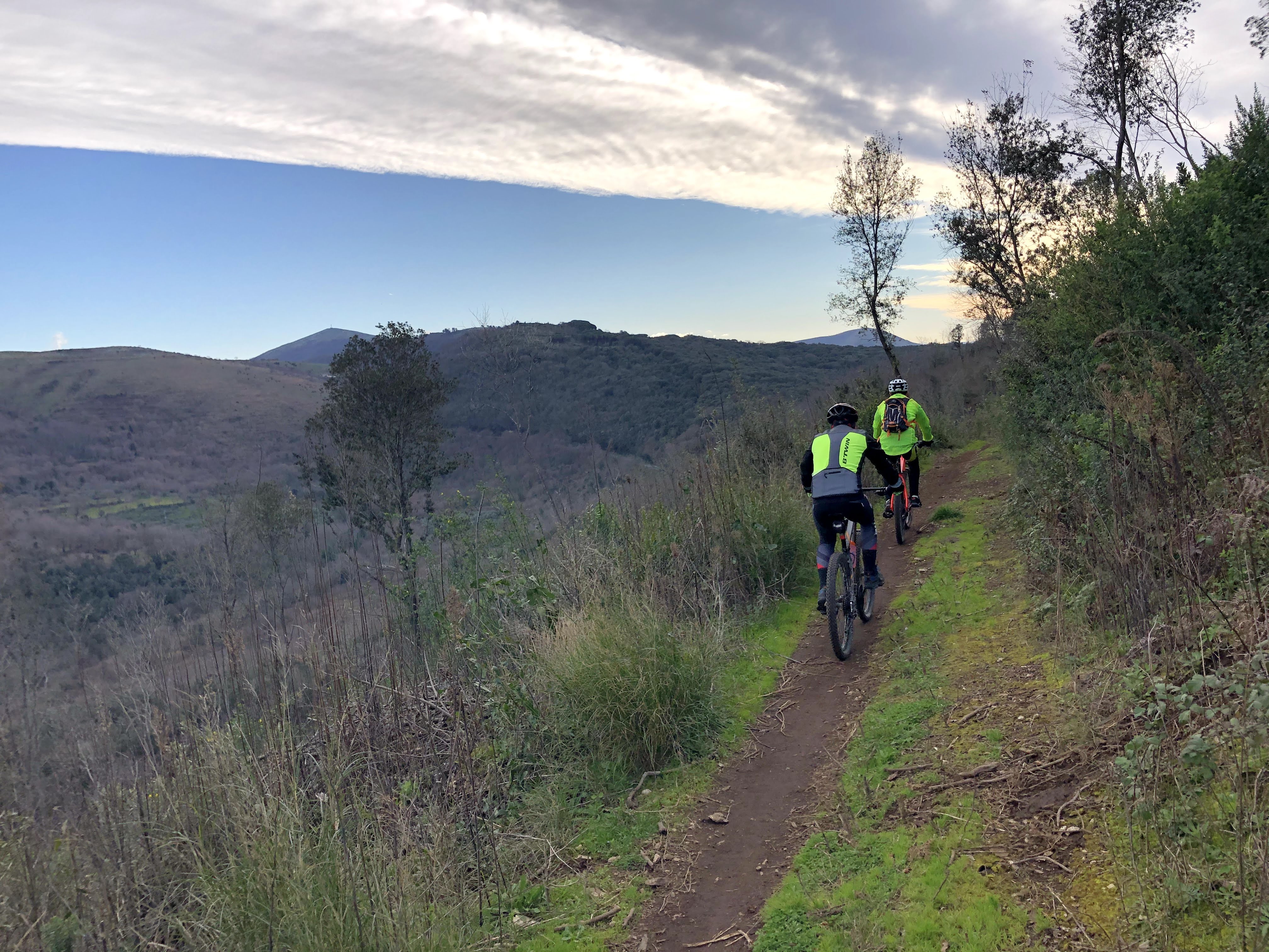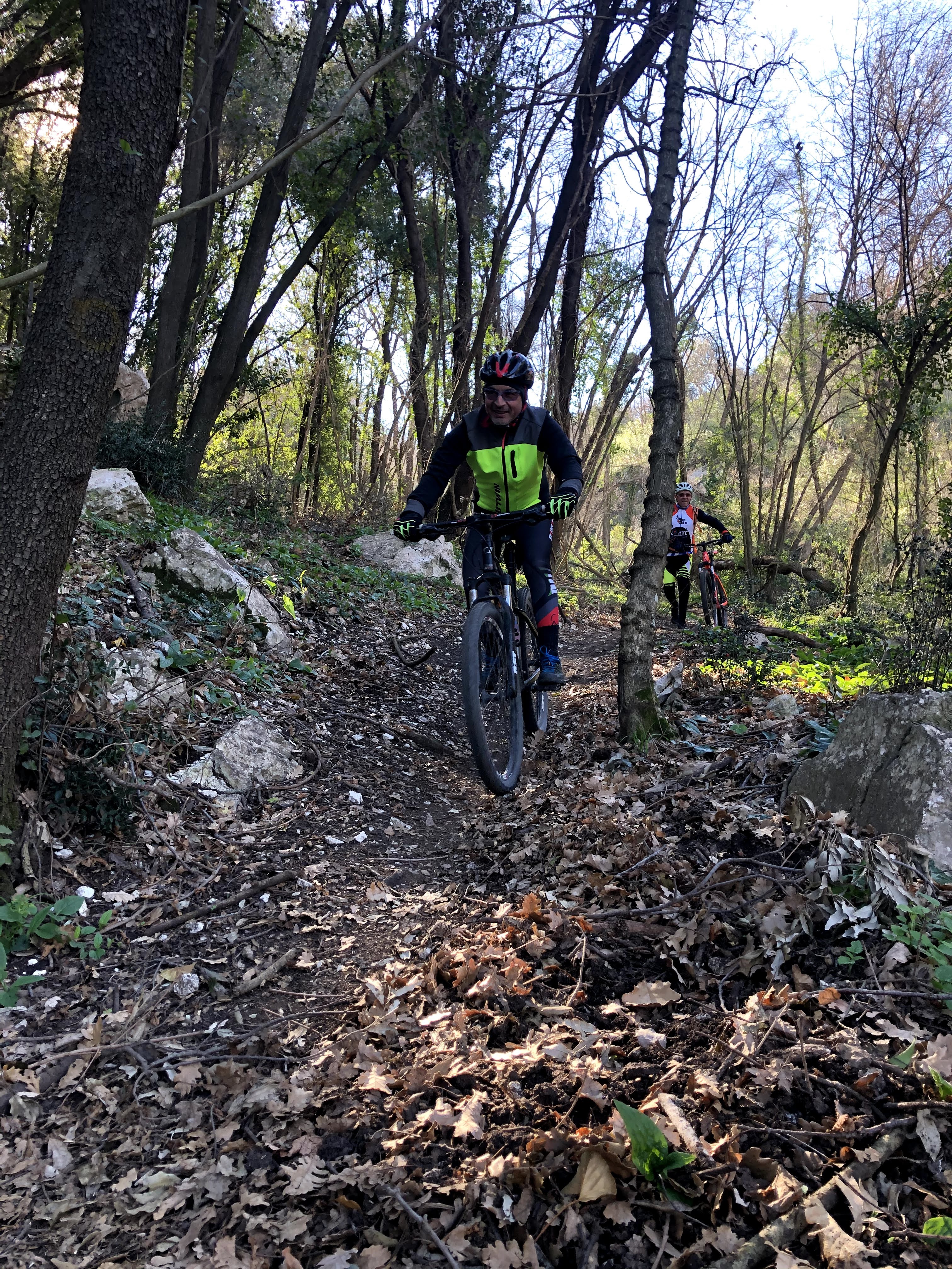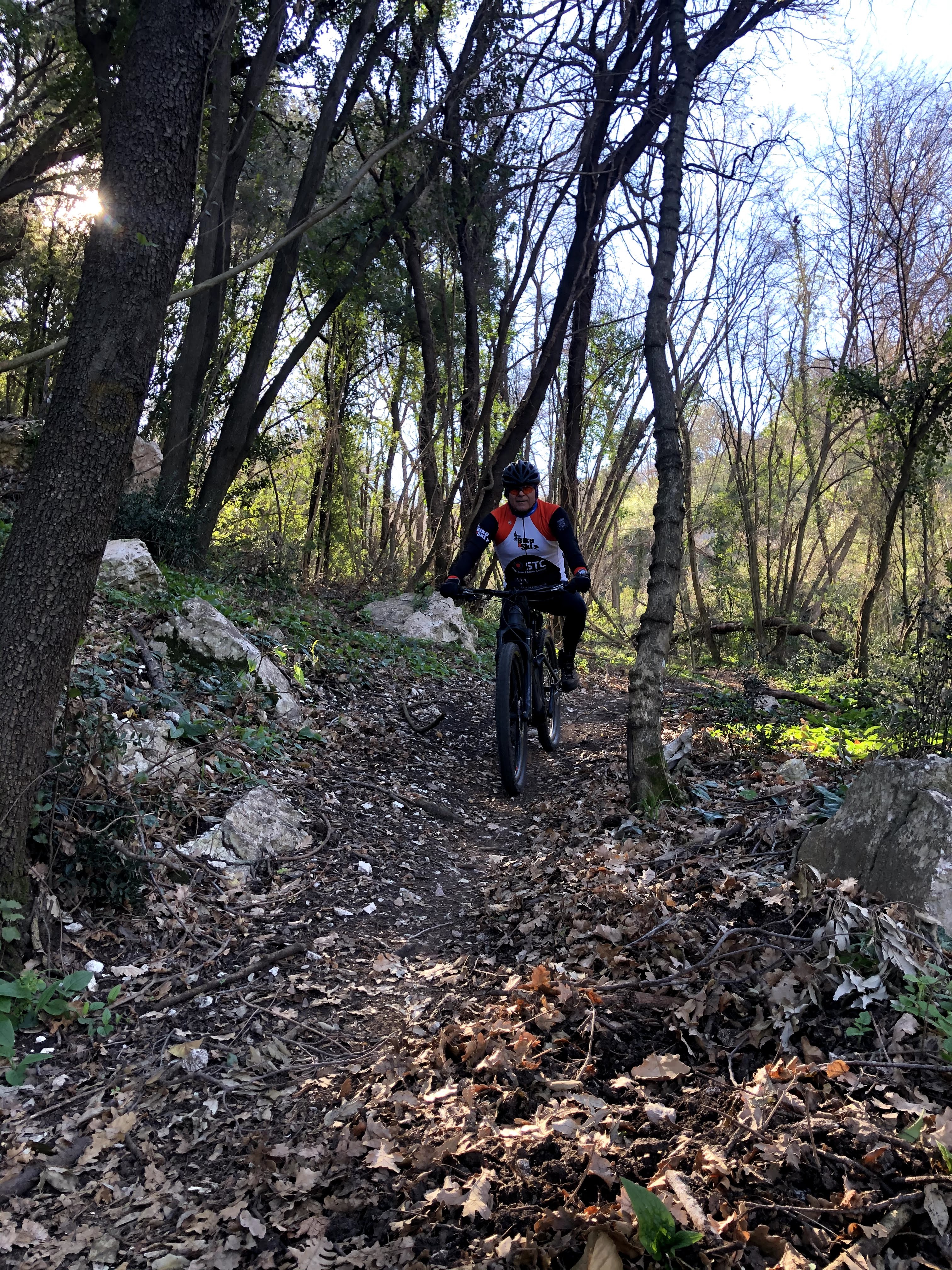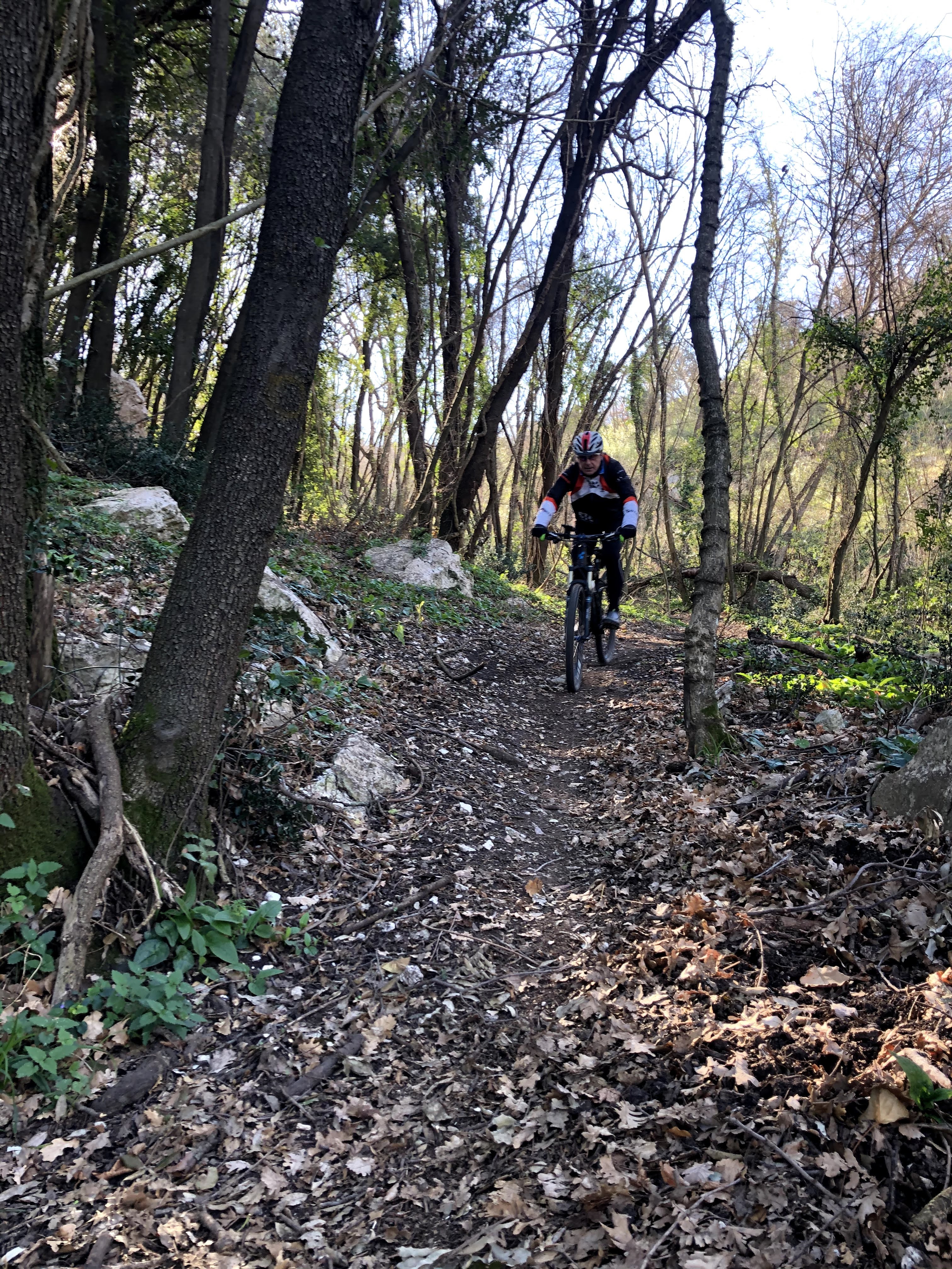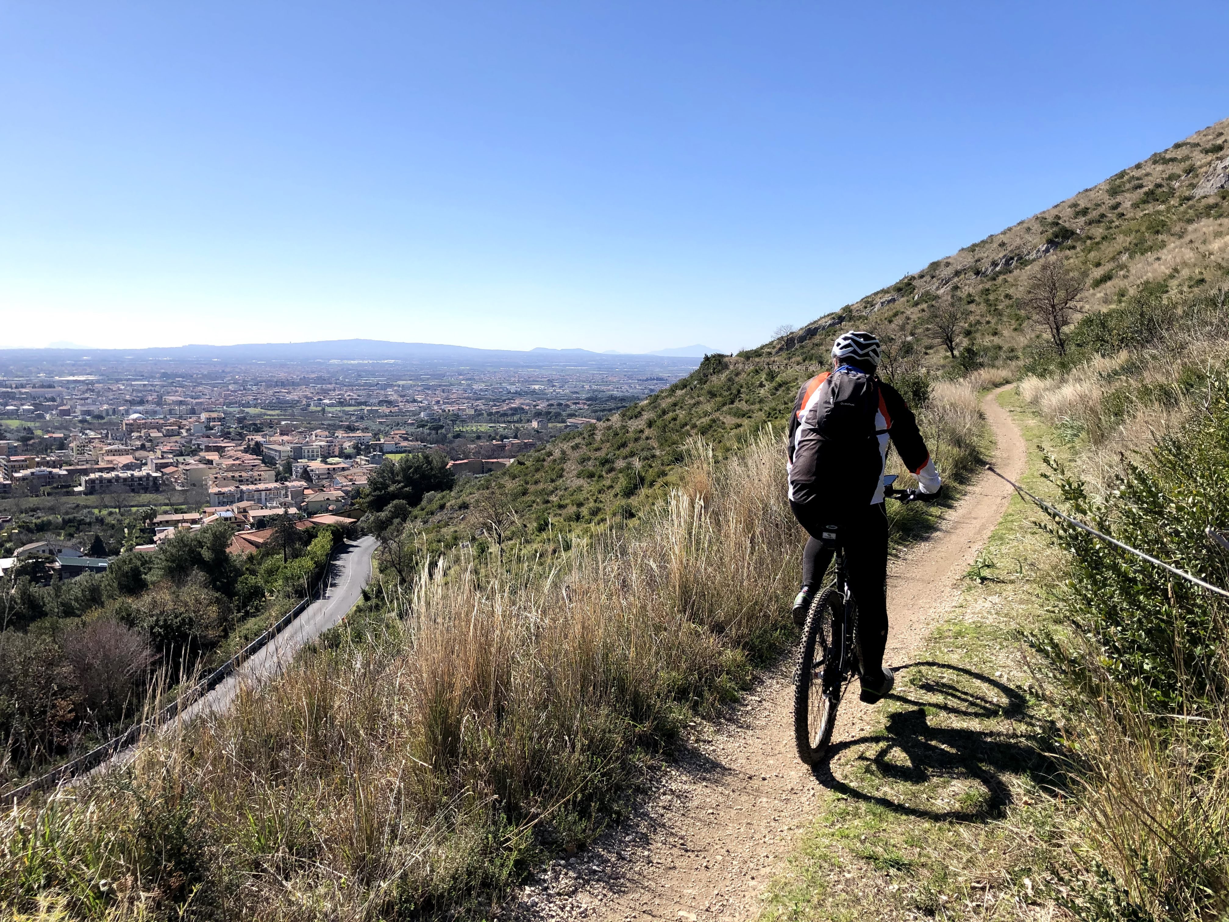 Dopo una breve salita su asfalto iniziamo un single track, veloce e panoramico, tra boschi e tratti con esposizione a sinistra sul versante nord - est dei monti Tifatini.