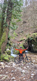 Ore 13.05. km 15,9. Il tratto ripercorso in senso opposto, seppur in discesa, non è meno faticoso, dovendo oltrepassare nuovamente le decina di tronchi che sbarravano la via. Il primo ad arrivare è Raimondo, che si accorge di un altro sentiero che corre lungo il ruscello. In effetti sembra questo il sentiero presente sul Garmin di Alfonso. Ed è il Direttore, che sopraggiunge subito dopo Raimondo a partire in avanscoperta. "Raimondo qui non c'è campo. Io vado e se il sentiero è promettente lancio il segnale di via libera Bike&Ski, ovvero 3 fischi".