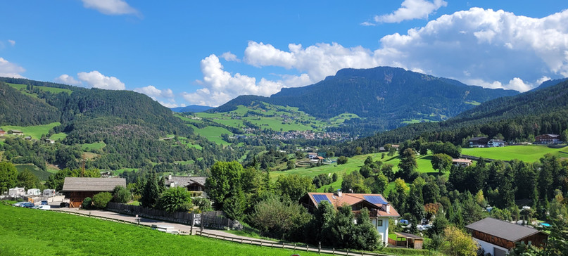 Al momento il meteo è buono e cominciamo a sperare che l’acquazzone previsto nel pomeriggio non si verifichi (vana speranza ?). Riprendiamo il cammino in sella e affrontiamo 5 chilometri di saliscendi fino a Siusi allo Sciliar.