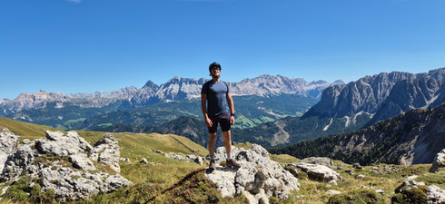 Alla spicciolata percorriamo i quattro chilometri in saliscendi sul pianoro fino al rifugio Pralongià. Prima dell’arrivo al rifugio, ci fermiamo in un punto super-panoramico e qui ogni atleta viene immortalato in tre scatti iconici: con alle spalle Cir, poi il gruppo Sella ed infine la Marmolada.