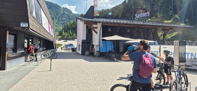 Comincia a grandinare. Arriviamo a Ortisei e, sotto una pioggia incessante, prendiamo le scale mobili. La pioggia concede una piccola pausa, il tempo di raggiungere la navetta e prelevare il famoso sacchetto per la notte, che stipiamo nello zaino. Le bici non sono molto scariche. Si decide quindi, per alleggerire il peso, di non portare tutti i caricabatterie ma solo 5. Raimondo acquista i biglietti per la storica funicolare del Resciesa. Nonostante il meteo siamo sereni. Dopo poco siamo a monte. Ed apriamo le porte.