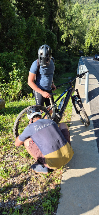 Arrivati a Tires, percorriamo su asfalto un paio di chilometri per poi tornare su uno stretto trail che corre parallelo alla statale. E qui avviene il primo serio contrattempo. Un laccio della scarpa di Luca, colpevolmente lasciato lungo dall’atletico figlio del Presidente Roberto, si avvolge nella catena e blocca il cambio. La rotazione successiva spezza il forcellino e deforma irreparabilmente il cambio.